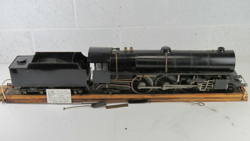 A 2 1/2" gauge 4.6.2 model live steam engine locomotive and tender, with card "Fayette built by the late Glen Black. Freelance Design Pacific. Baker valve gear", finished in black on wooden base measuring 100cm in length.Does not have a boiler certificate.