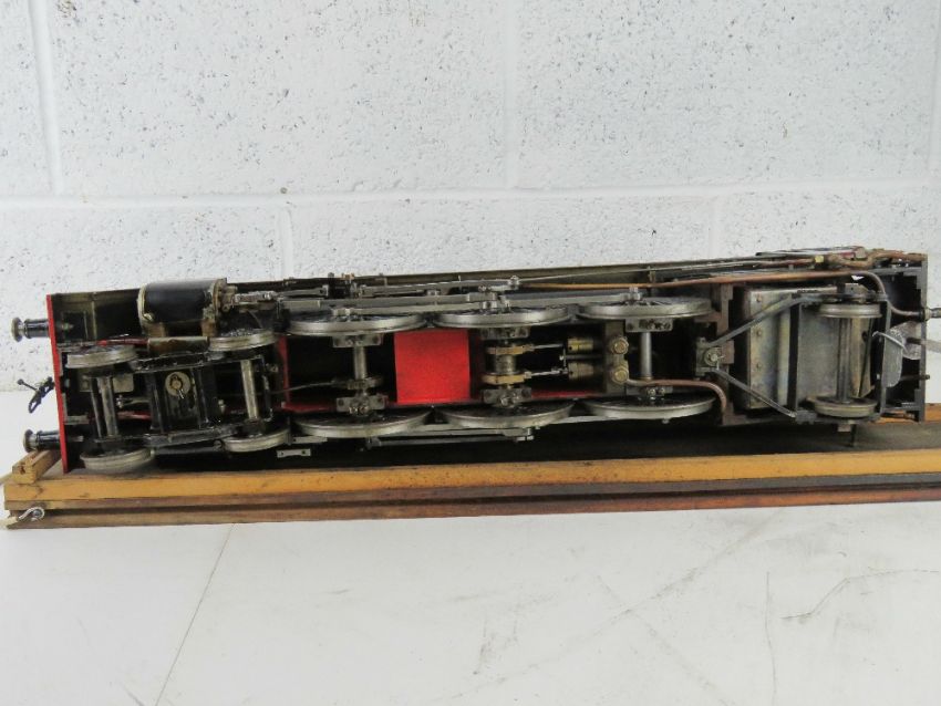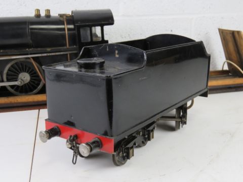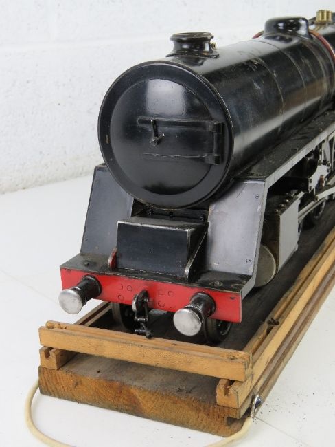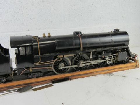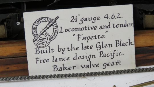 A 2 1/2" gauge 4.6.2 model live steam engine locomotive and tender, with card "Fayette built by the late Glen Black. Freelance Design Pacific. Baker valve gear", finished in black on wooden base measuring 100cm in length. Does not have a boiler certificate.