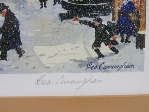 George Cunnigham; signed limited edition print 'Crookes' being a snowy Sheffield street scene, signed in pencil and numbered 254/500, framed and mounted, overall size 43 x 38cm. Together with five other George Cunningham prints in matching frames, two bearing black pen signatures upon. Six items.