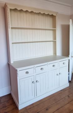 A large cream painted Welsh dresser. The base having four doors and three drawers, the top with two shelves and shaped pediment over. 170cm wide, 234 high, 64 deep.