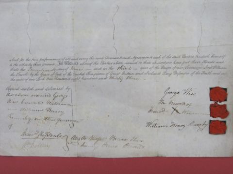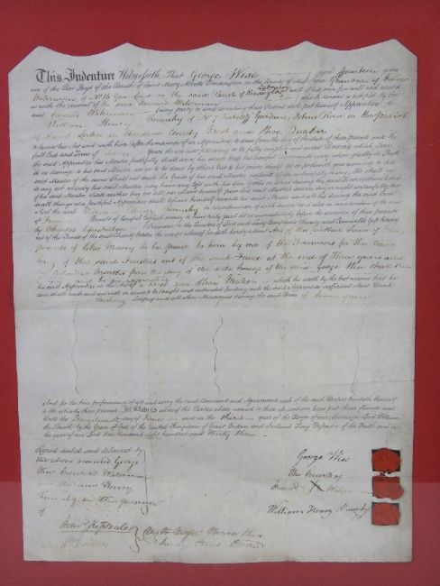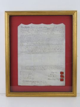 Apprenticeship Bond dated 17 June 1833. English. Main text partially printed. George Wise aged 14 puts himself apprentice to William Henry Rumsby of 7 Ratcliffe Gardens Boot and Shoe Maker for Seven years. Three seals with signatures of Wise, Rumsby and mark of Edward Waterman. In contemporary display frame. Dorse measuring 26cm wide Framne measuring 39 x 46.5cm