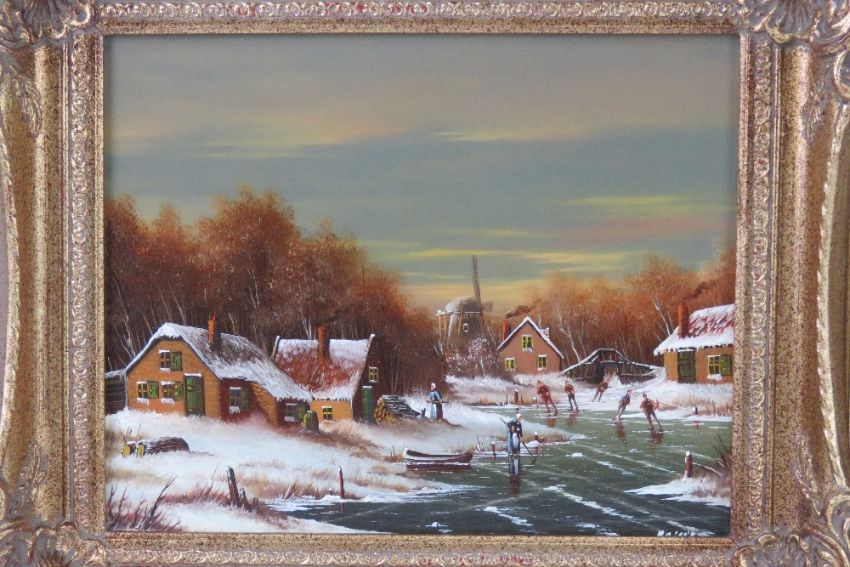 Jean Kaiser (Dutch, 1922-), a pair of oils on board of winter ice skating scenes, each 24 x 19cm (sight size), in matching frames, each measuring 33 x 28.5cm overall. With associated receipt.