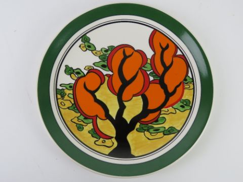 A Clarice Cliff design later produced by Wedgwood; four decorative plates in Bizarre patterns 'Orange Erin', 'Orange House' (x2 one with certificate), and 'Honolulu'.