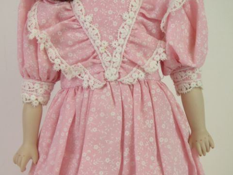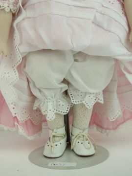 A handmade 20th century bisque headed doll made using an antique doll mould, having fine custom made outfit. In support frame, standing approx 43cm high.