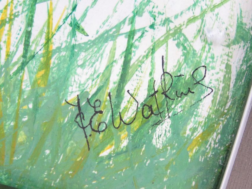Frank Watkins; Oil on board 'High Point' featuring Blue tit sat on the handle of a fork, gallery label upon, framed, 28.5 x 35.5cm.