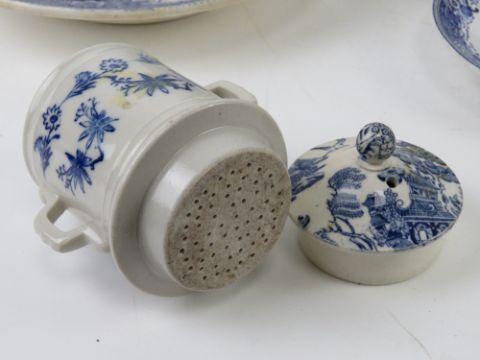 Blue and white ceramics including tea strainer, coffee cups, two contemporary lidded tureens