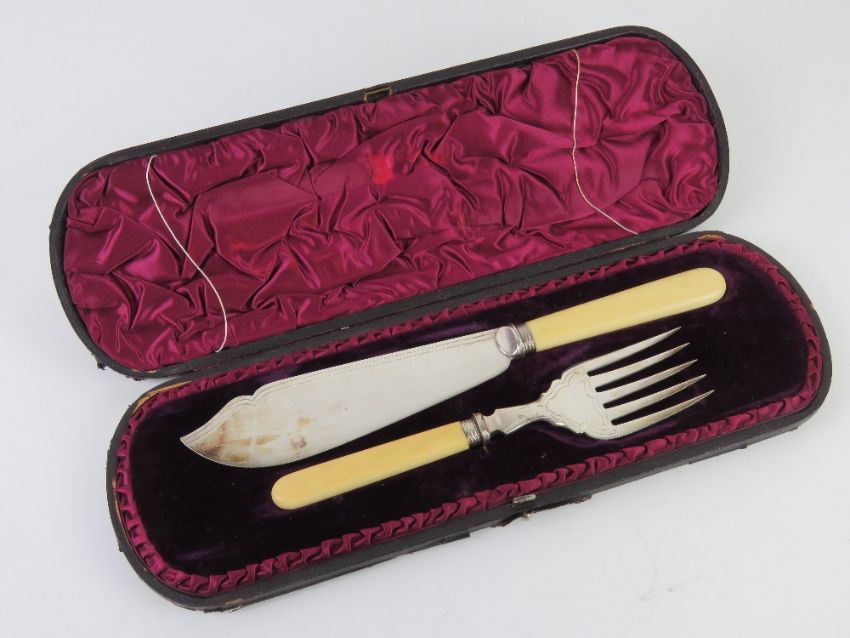 A boxed presentation fish serving set comprising plated knife and fork with ivorine handles.