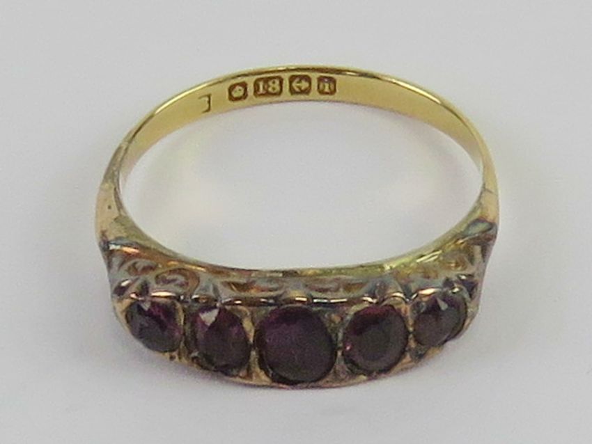 An 18ct gold Victorian ring set with five oval cut foil backed amethyst coloured stones, hallmarked for Birmingham, size R-S, 2.5g.