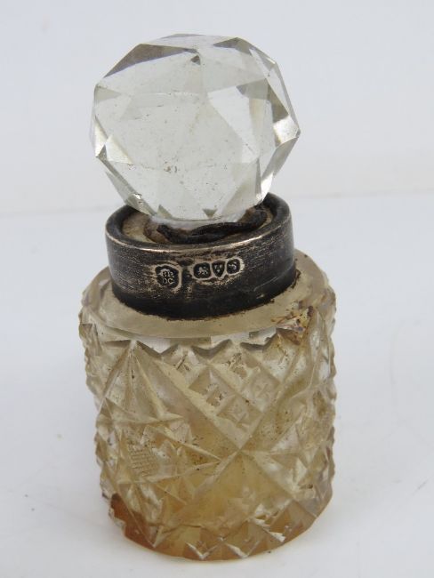 A HM silver and cut glass perfume bottle together with a quantity of vintage pens and pen nibs.