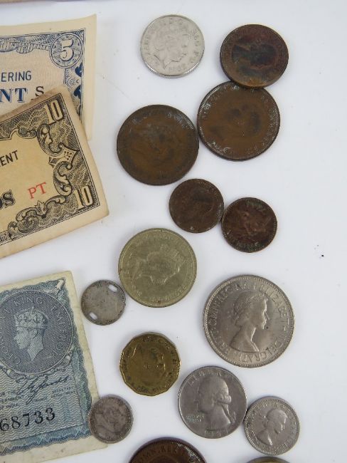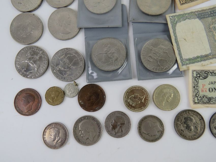 A quantity of 20th century coinage, bank notes and commemorative coins. Includes a quantity of half silver 1921-43 coins weighing 87.6g (half crowns, Australian 1927 florin, etc).