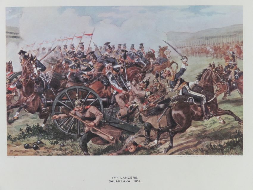 Two prints from original by R Simpkin being Prince of Wales Royal Hussars and 17 Lancers Balaklava 1854, framed, each measuring 51 x 41.5cm. Together with an American Civil War themed print, mounted, unframed.