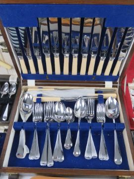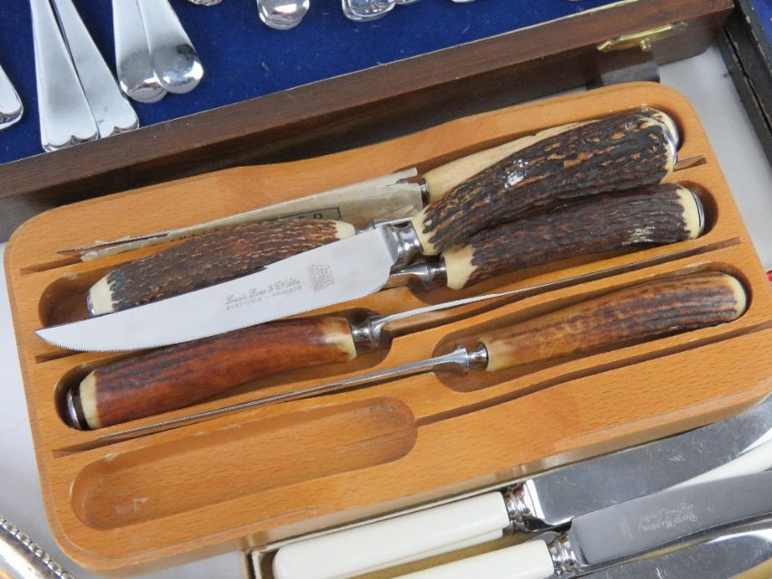 An oak canteen containing a quantity of plated cutlery inc meat fork and knife, servings spoons, etc. Together with a quantity of assorted boxed sets of flatware.