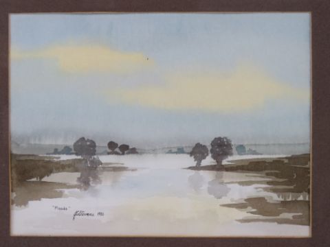 Three watercolours by J G Stevens titled 'Fisherman's Croft', 'Durham' and 'Floods', each framed and mounted, largest 48 x 36cm overall.
