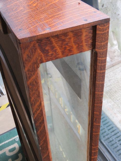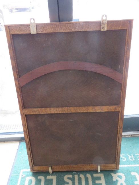 A good oak wall display cabinet with twin sliding glass doors marked upon 'Albert Crow Fishing Tackle Tove A C Hesketh Estate Day Tickets, 70 x 108cm.