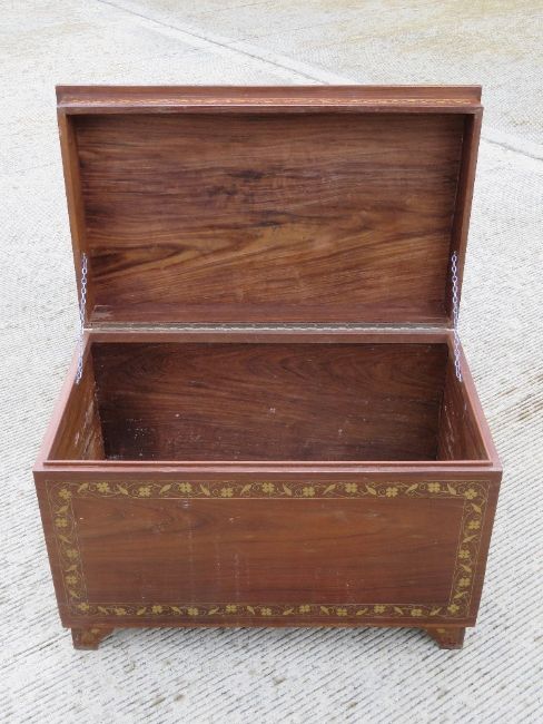 A 20th century Indo Asian lidded trunk inlaid with brasswork and measuring 76 x 45 x 52cm.