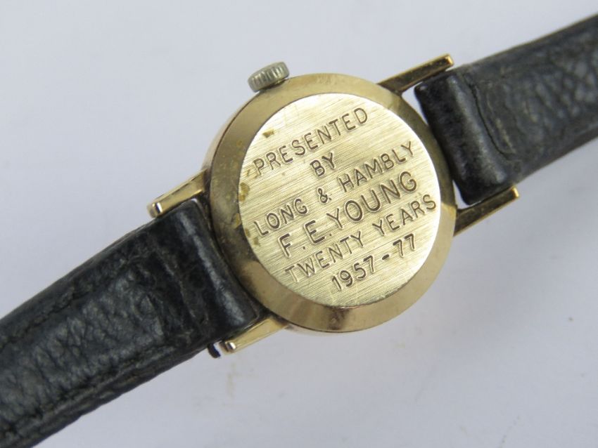 A 9ct gold ladies Omega wristwatch having champagne dial marked for Omega, crown wheel, strap, case back and movement also all marked for Omega, hallmarked for London, case back bearing inscription and weighing 1.5g.