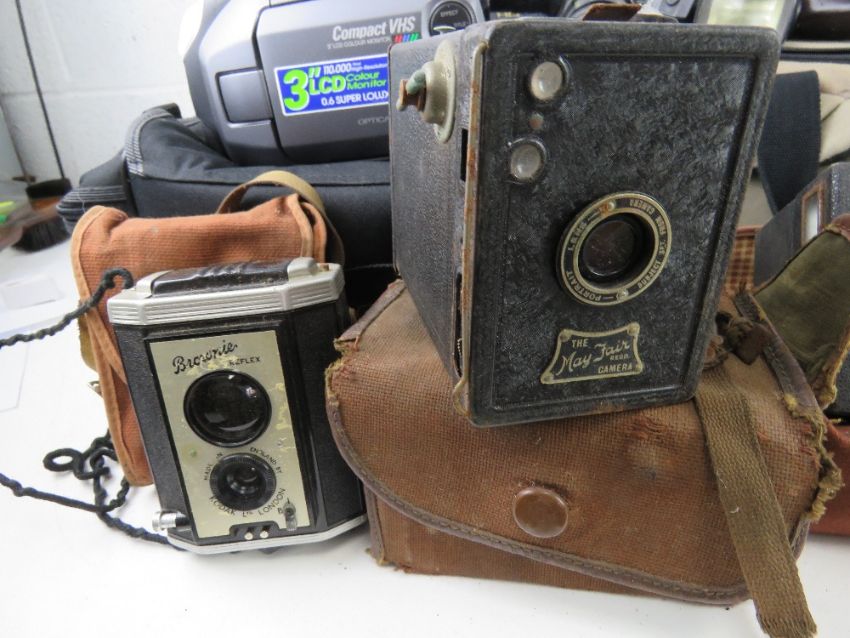 A large collection of vintage and contemporary cameras and binoculars inc Canon AE-1, JVC Compact VHS video camera in original bag, Ferguson Videostar in original bag, Ven1t, Popular Brownie by Kodak, The May Fair camera, Brownie Reflex, etc.