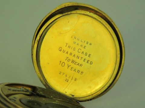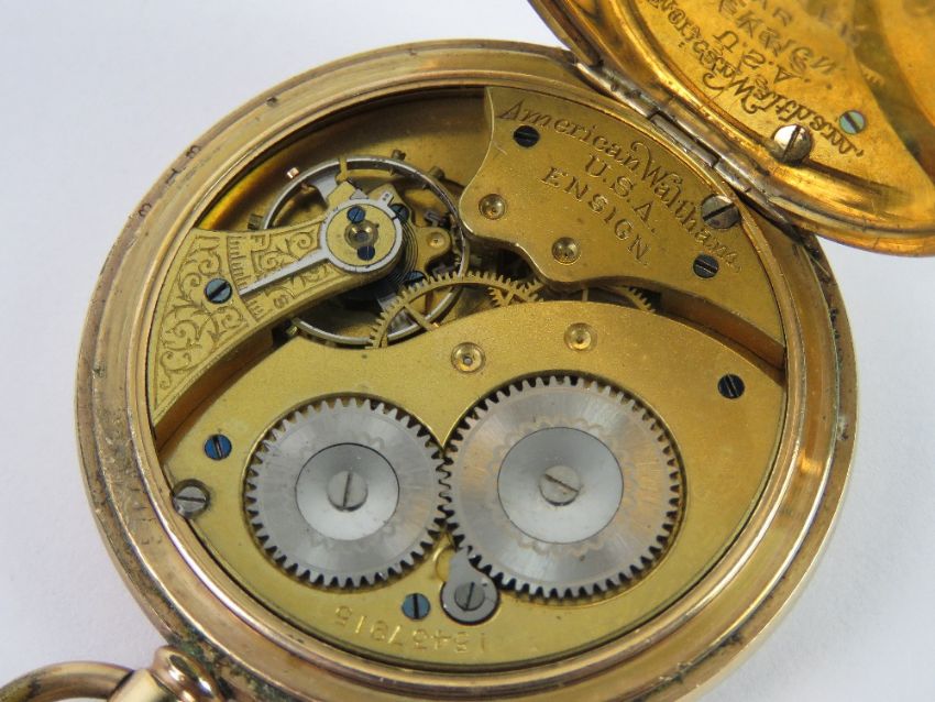 A gold plated Waltham pocket watch, top wind, Star case, white enamel dial with yellow metal hands and subsidiary seconds dial with blued steel hand, movement marked American Waltham USA Ensign 15437915, 49mm dia, total weight 81.9g.