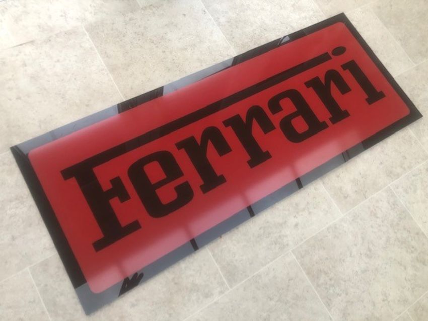 A large Ferrari-themed garage wall sign. Rosso red ground with black writing on a durable celluloid base. Measuring 100 x 40cm.