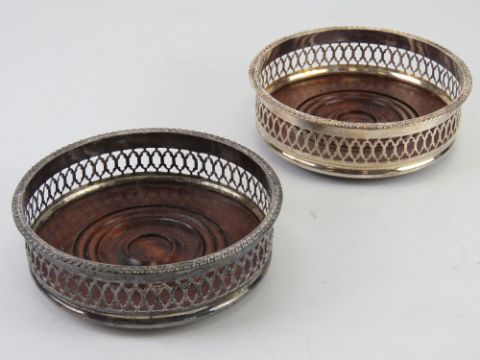 A pair of Georgian style silver plated mahogany based wine stands having fretted sides, 13.5cm dia. Crossed keys makers mark upon.
