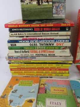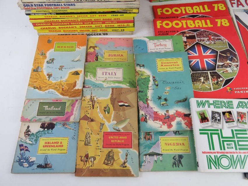 A quantity of c1960s and 70s football memorabilia inc Charles Buchanan's soccer gift books, Goal magazines, 1966 World Cup Final newspaper souvenir cover, Esso collection of football club badges.