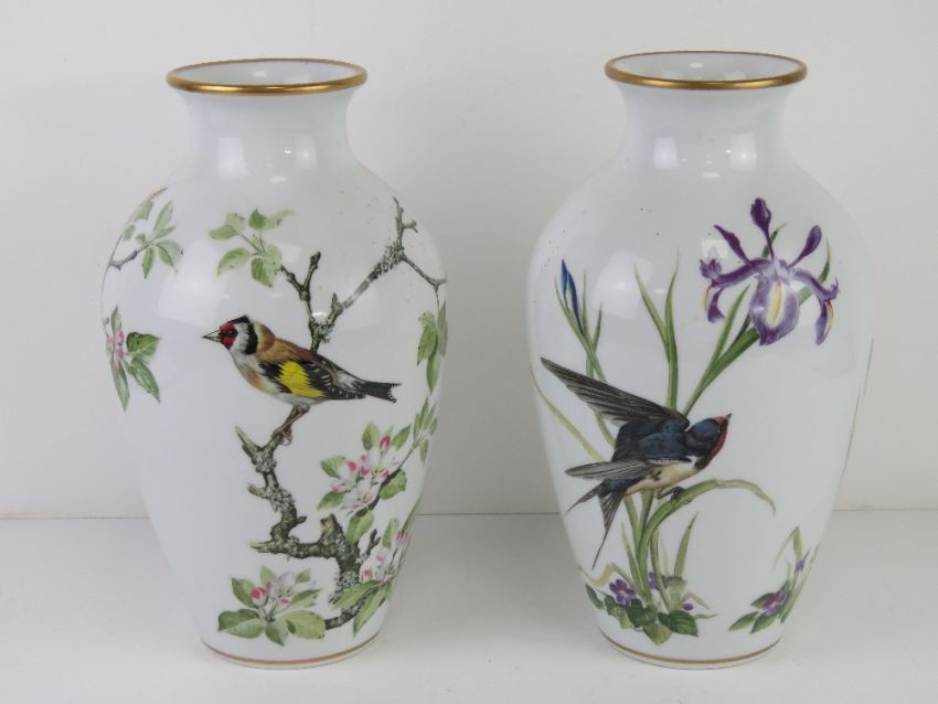 A pair of Franklin Porcelain vases being Woodland Bird and Meadowland Bird, dated 1980 and 81 respectively, each 30cm high.