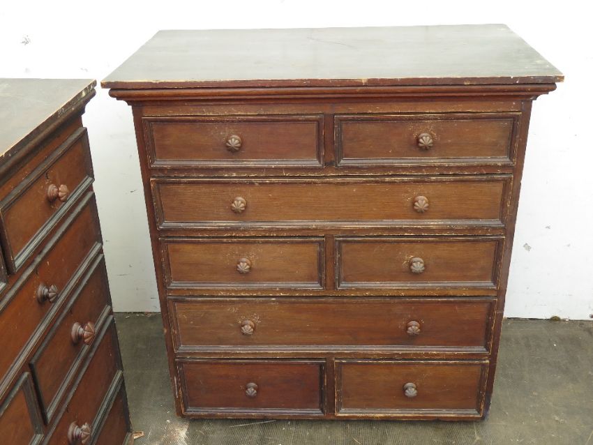 A suite of two matching chests of drawers, one large one small, each having large quantity of drawers with matching handles, 95 x 54 x 100cm, 131 x 52 x 100cm. Victorian. Stained pine.