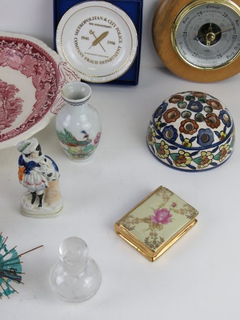 A quantity of assorted oddments including ceramics, flying Dutchman clog lamp for rewiring, barometer, Jerusalem Olive wood cigarette holder, etc.