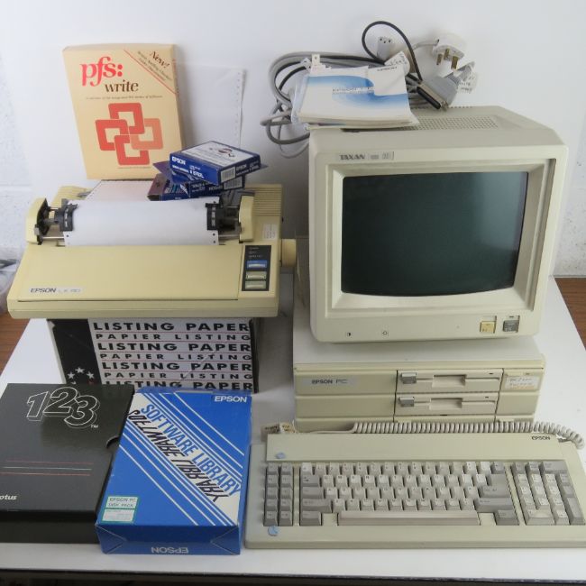 An Epson 1980s vintage PC with Taxan Super Vision monitor, Epson LX80 printer, original keyboard and quantity of associated items including operation manuals. Bought in 1986 and used continually for word processing until a couple of years ago when the 'ribbon' (ink) needed replacing.