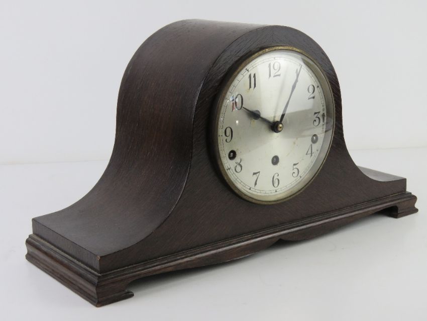 A three train Napoleon hat mantle clock by Garrards, silvered dial with Arabic numerals, all within dark oak case, 42cm wide.