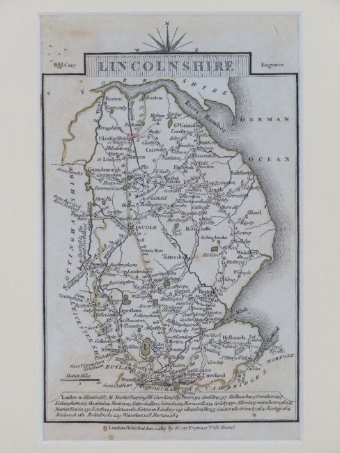 Maps; Six reproduction maps each from engravings by J.Cary being Nottinghamshire, Essex, Lincolnshire, Buckinghamshire, Huntingdonshire and Staffordshire, all framed, various sizes, largest 41.5 x 35cm overall.