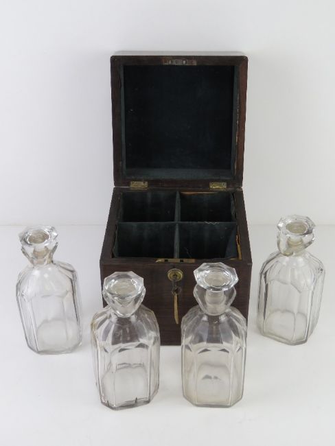 A fine Victorian rosewood tantalus having flush fitting swing handle to the lid, with the initials S.A with crown over, the lid lifting to reveal four fitted decanters with stoppers in quatreform velvet lined compartment, with key and label, 23 x 20 x 20cm.