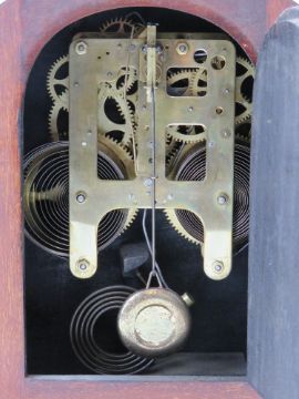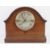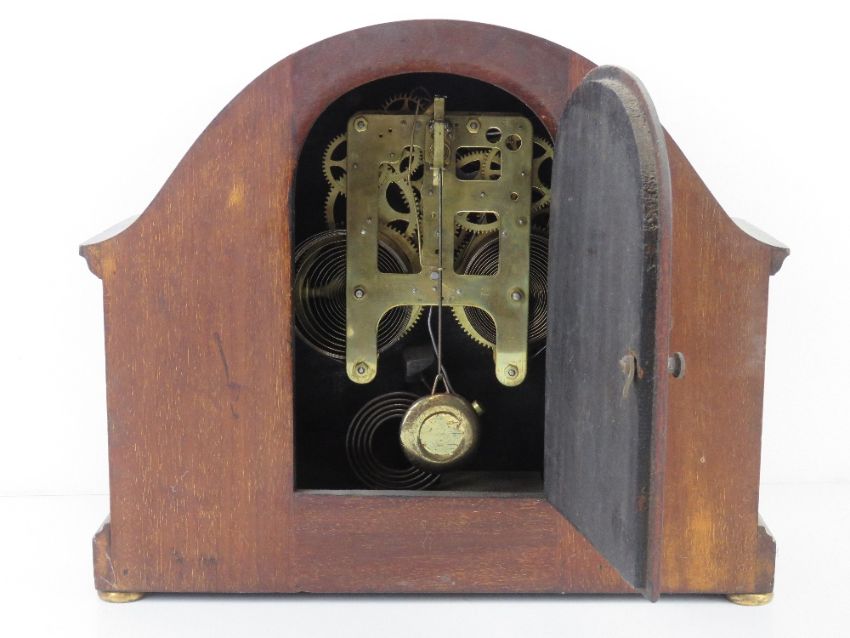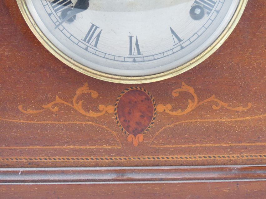 An Edwardian mantle clock, silvered dial with Roman numerals all before the two train clockwork movement within inlaid mahogany case, all over squat bun feet, 33 x 28 x 13cm.