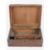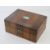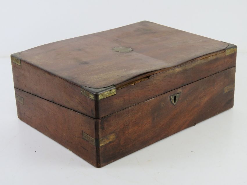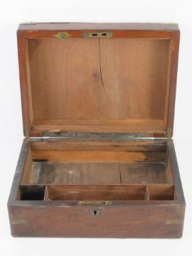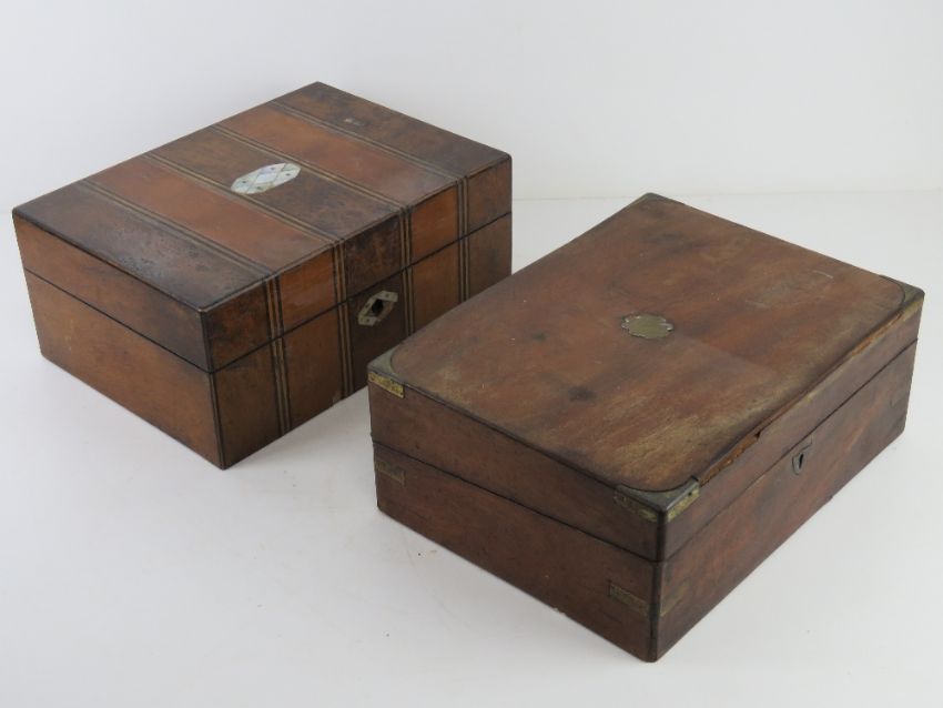 A Victorian workbox having Mother of Pearl and boxwood inlays, 30cm wide, opening to reveal purple silk lining to lid, a/f. Together with a mahogany writing slope having brass corner bracing, a/f. Two items.