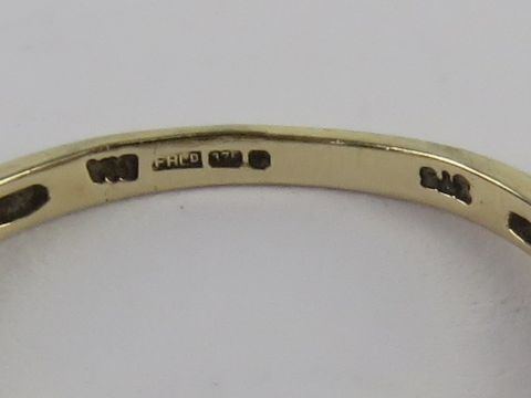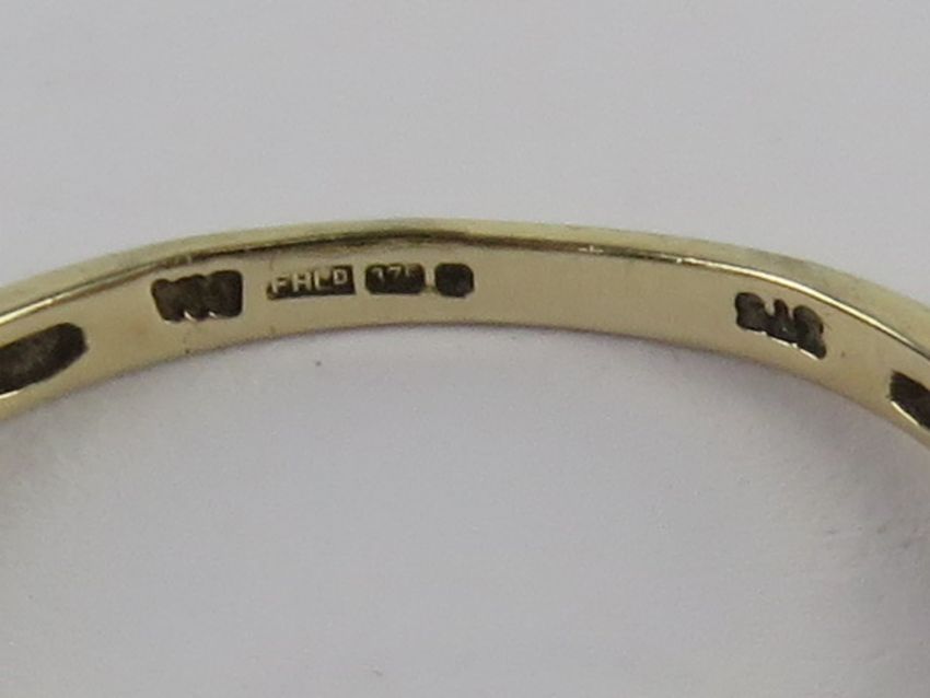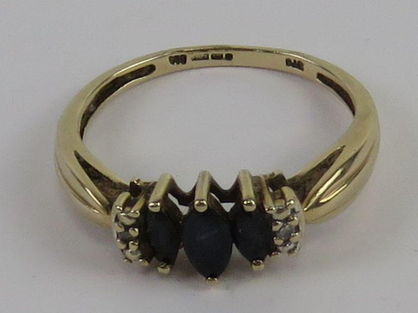 A 9ct gold sapphire and diamond ring, three graduated marquise cut sapphires to centre with trio of diamonds to each side, size P, 2.1g