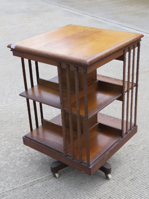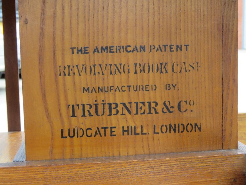 A large revolving late Victorian Canterbury bookcase raised over quatreform base terminating in ceramic castors. 60 x 60 x 93cm. Stamped upon American patent revolving bookcase as retailed by Trubner and Co London.