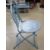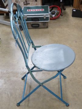 A pair of blue and grey painted metal bistro chairs.