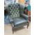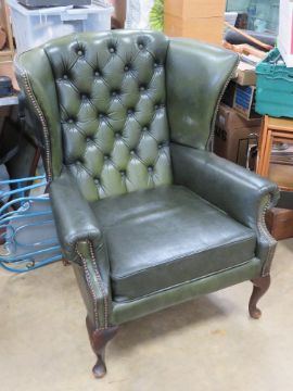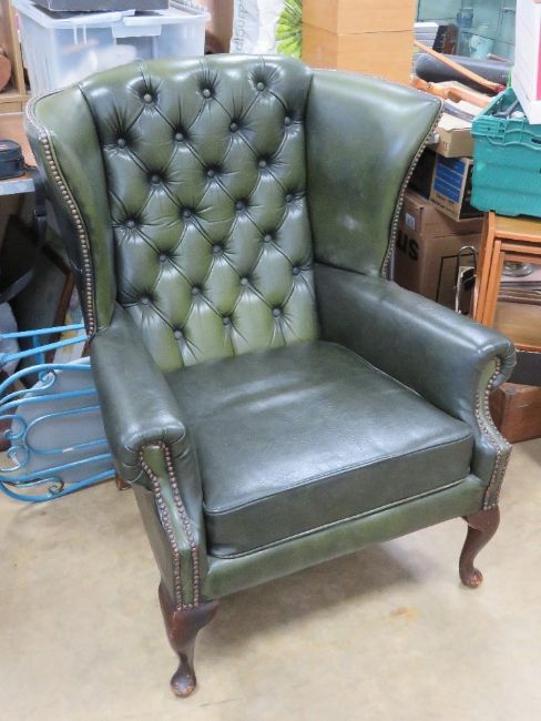 A green upholstered wing back arm chair approx 82cm wide, 1m high at back.