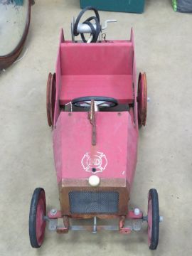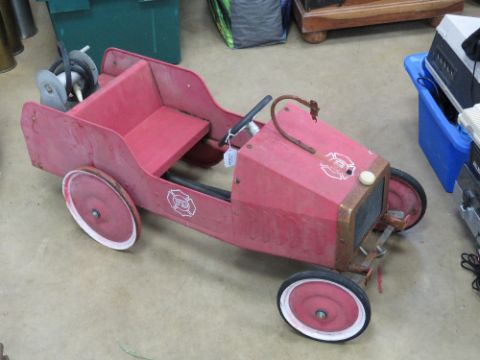 A vintage 'fire engine' pedal car having FD emblem upon, in unrestored condition, approx 96cm in length.
