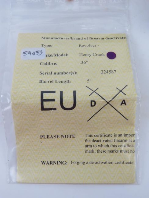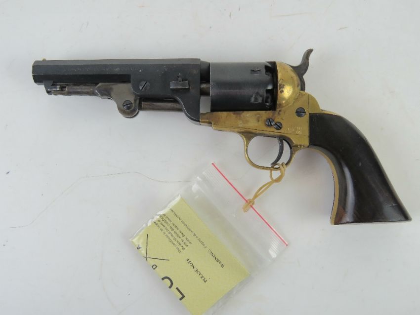 A reproduction deactivated Colt Navy .36 Calibre Black Powder Sherriff's Revolver. Italian made. Latest EU spec moving trigger and rotating cylinder, with certificate.