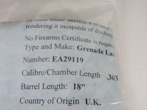 A deactivated Lee Enfield Grenade Launcher. Bolt action with full action and strippable (classed as a grenade launcher). With certificate.