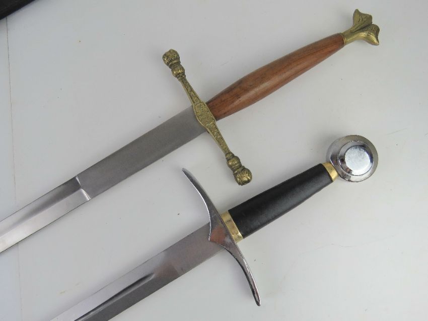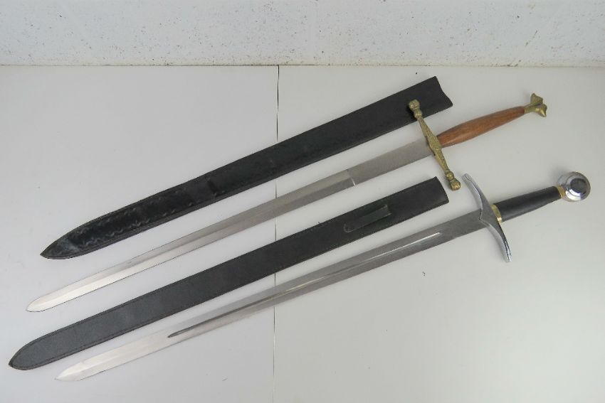 A decorative re-enactors 'Lion Heart' Sword with sheath, in the Crusades 12th/13th century Medieval style. Together with another Medieval style re-enactors Carlos.V sword with sheath.