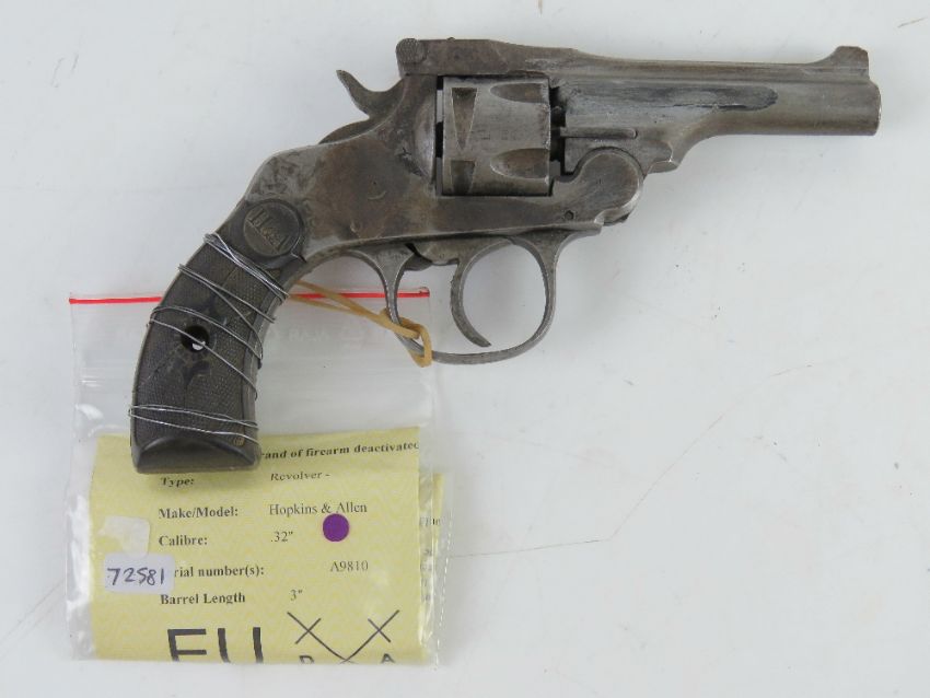 A deactivated Hopkins and Allen No. 3 .32 RF Revolver, moving trigger, hammer, and clear revolving cylinder. With certificate.