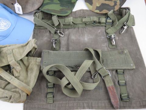 A quantity of military items; WWII German M42 Helmet in relic condition, British Bayonet frog, British roll bag, webbing pouches, helmet cover, four hats and sling.