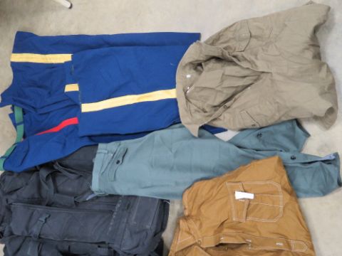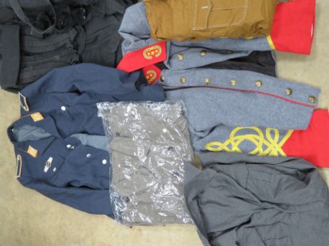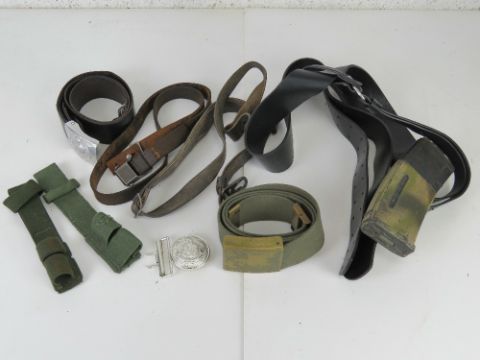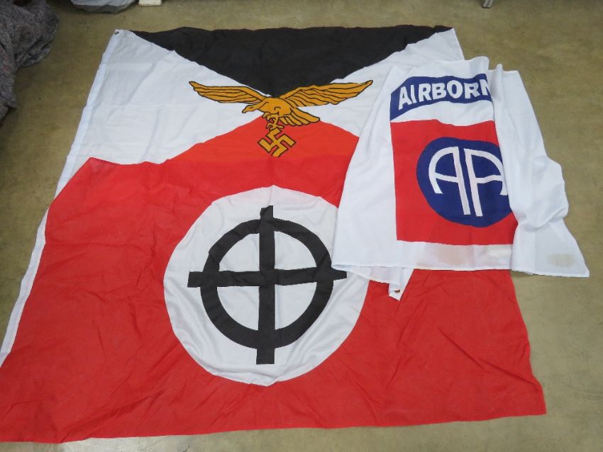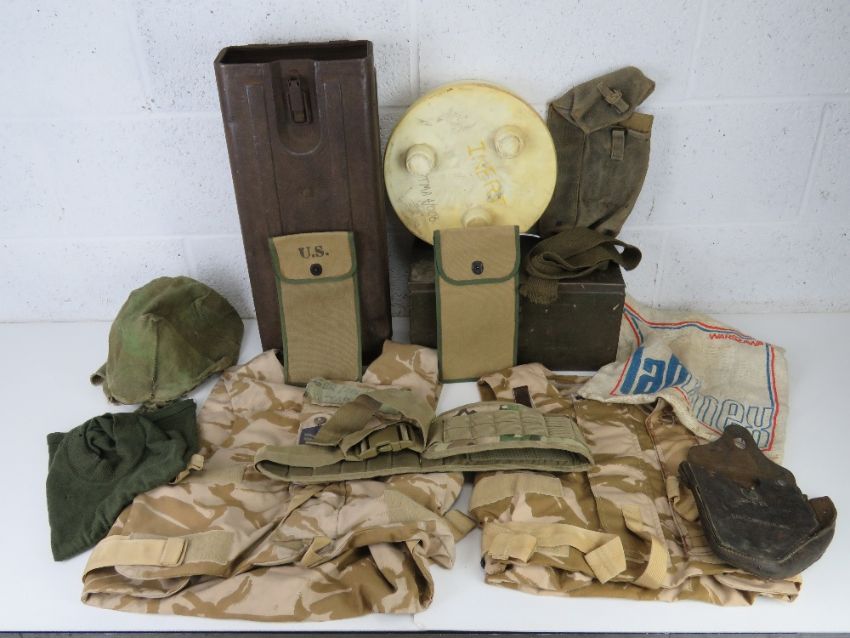 A quantity of assorted militaria and reproduction re-enactors items including; M18 carrying case, Desert body armour vests, Airborne flag, TMA-4 inert mine, shell transit box, British tool box, Bren mag pouch, bayonet frogs, camo helmet cover, flags, etc.