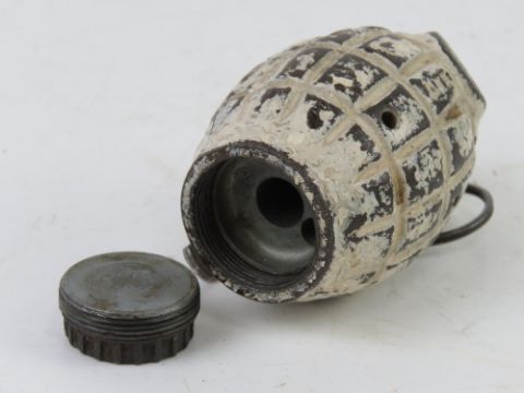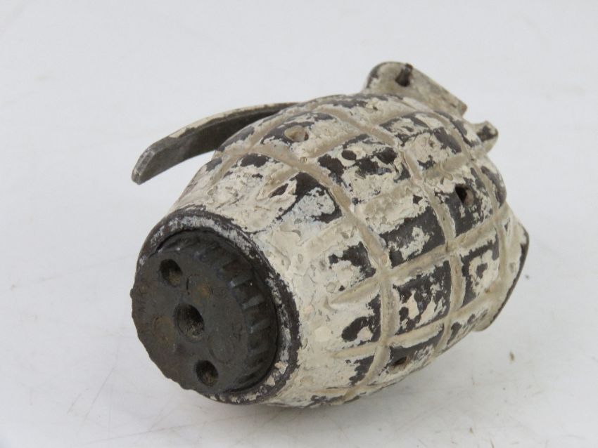 An inert British No.36 Mills training grenade with original paint, base dated 1943 and unscrews, with original spoon and pin, marked D.H.S on the spoon.