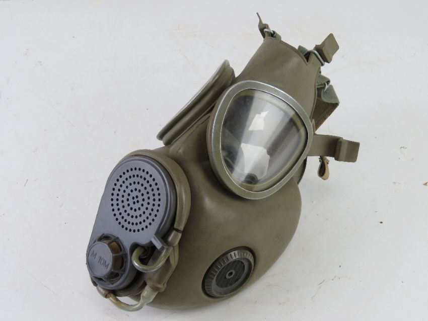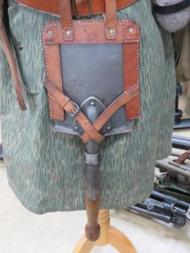 A Czech soldiers uniform on mannequin. Includes helmet with original liner, jacket, VZ58 ammo pouch which includes three magazines, bayonet frog, belt, Y-straps, shovel in carry pouch, water bottle, M10M size 2 gas mask in gas mask bag, and medical pouches.