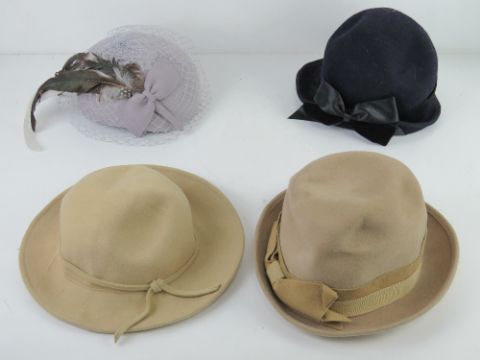 A vintage 100% wool felt hat by Viv Knowland in navy blue, together with a Kangol grey felt hat with netting and feather decoration two other vintage felt hats. Four items.