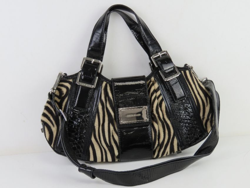 Karen Millen; faux zebra skin and black patent handbag approx 40cm wide.