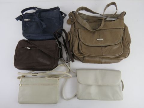 A leather shoulder bag by Lorenz together with four cross body bags. Five items.